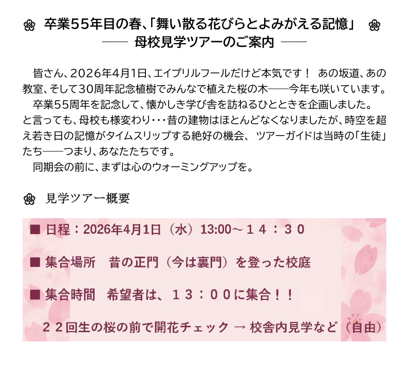 同期会前に、下記を企画しました。 どうぞ多数お越し下さい。- 2026年1月26日(月) 9:33:15![]()